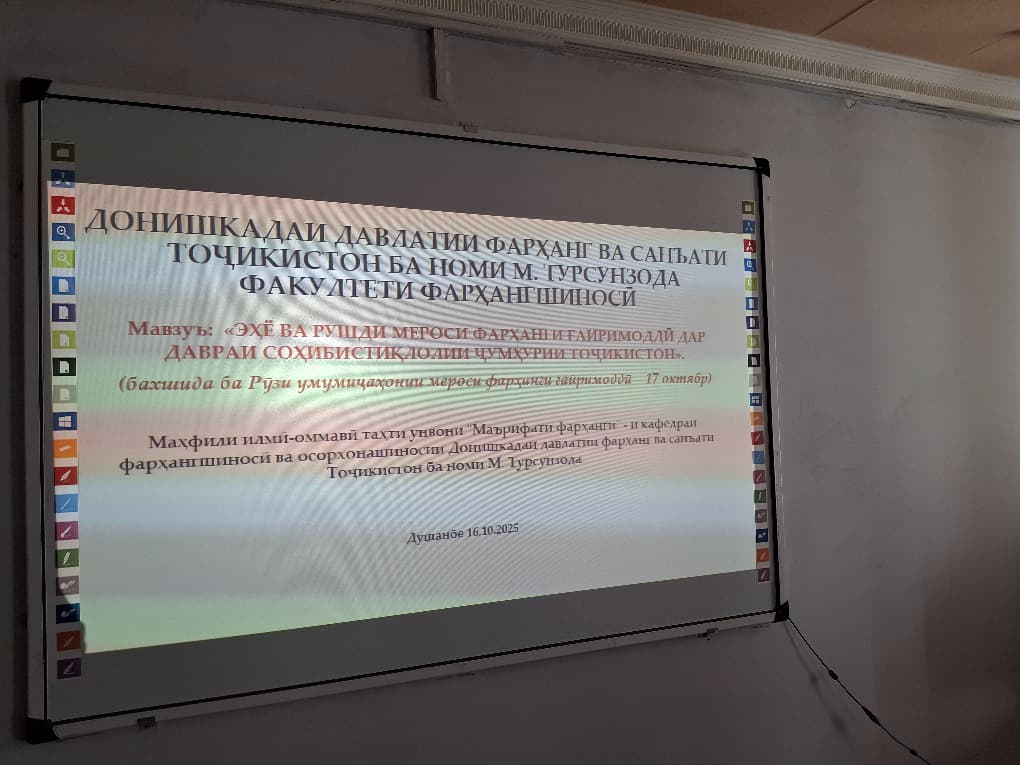 Имрӯз бахшида ба Рӯзи умумиҷаҳонии мероси фарҳанги ғайримоддӣ (17 октябр) дар бинои Донишкадаи давлатии фарҳанг ва санъати Тоҷикистон ба номи М. Турсунзода маҳфили илмӣ-оммавии навбатии «Маърифати фарҳангӣ» бо роҳбарии Мирзошариф Абдусаломов — омӯзгори калони кафедраи фарҳангшиносӣ ва осорхонашиносии Донишкада баргузор гардид.